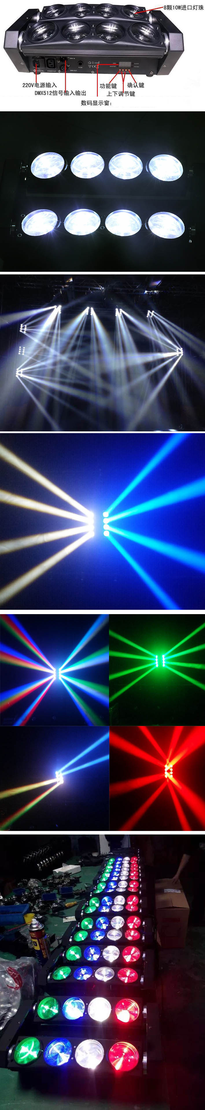 Voltage: AC90-240V, 50/60HZ Power: 150W Source: 8*10W LED American lumens lamp and 8*10W full color LED American Kerui lamp Color: white, color optional Control: DMX, master and slave, sound control, automatic mode. Dimming: 0-100% Display: LCD Channel: 6CHS The vertical scanning angle: 180 Light emitting angle: 4.5 degrees Weight: 5.5KG