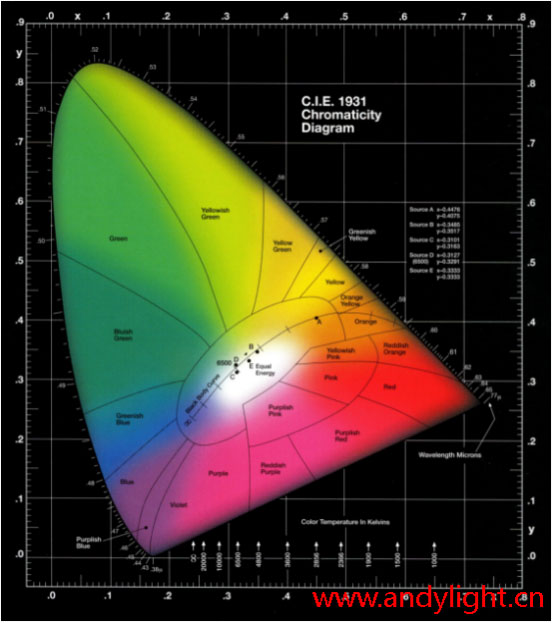 2. 做LED產(chǎn)品一定要會看色品圖,色品圖是以不同位置的點表示各種色品的平面圖。1931年由國際照明委員會(CIE)制定,故稱CIE色品圖,有人叫光譜圖也有色度圖反下叫化很多。